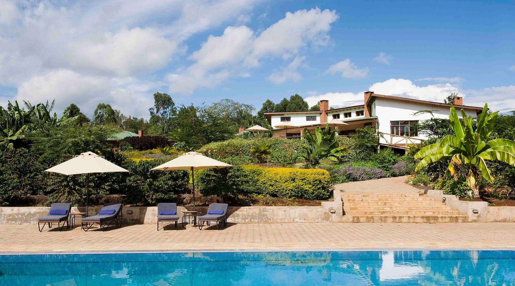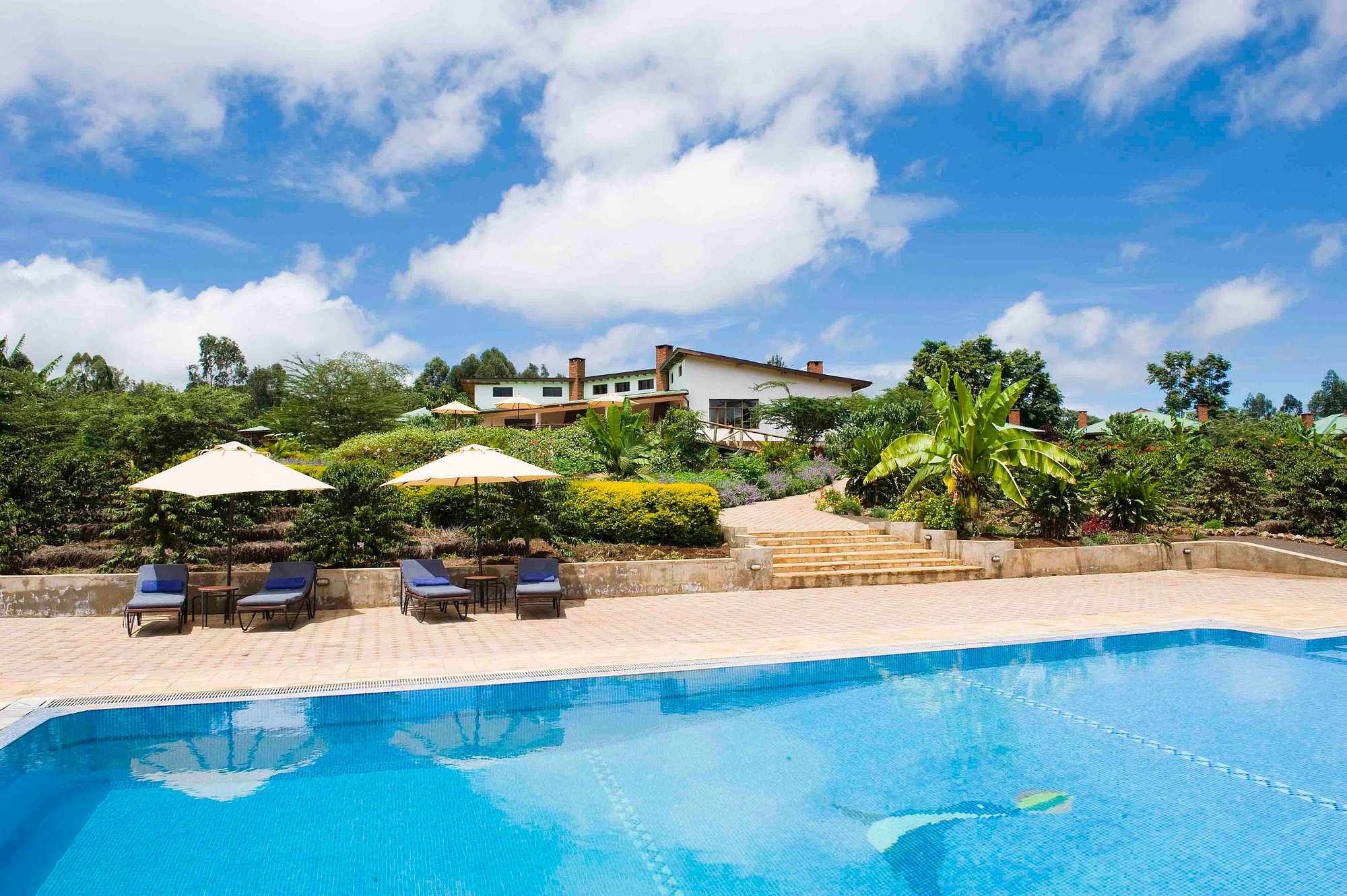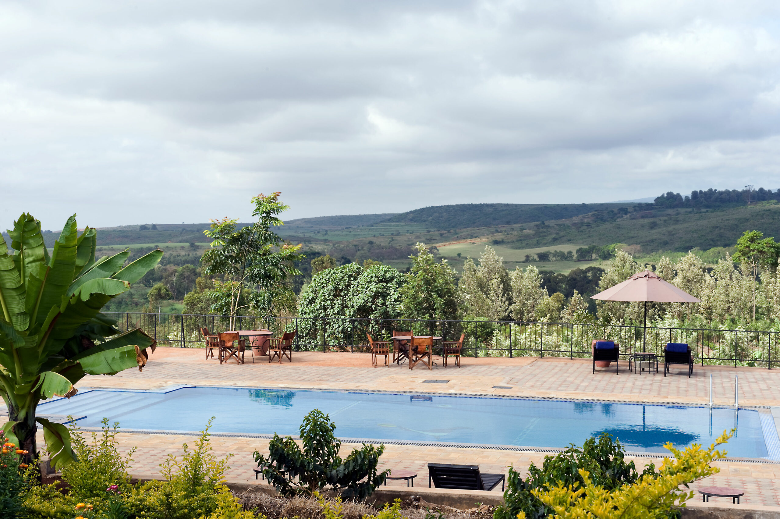The lodge comprises 36 spacious chalet‑style rooms, including standard, garden‑view, interconnected family suites, and en‑suite bathrooms. Every room opens onto a private terrace or veranda overlooking the grounds or plantation and includes a fireplace for cool highland evenings. The main lounge, bar, and dining area evoke a colonial farmhouse and serve meals made from estate‑grown produce, often enjoyed al fresco beside the solar‑heated pool or on the sweeping deck with crater vistas.
